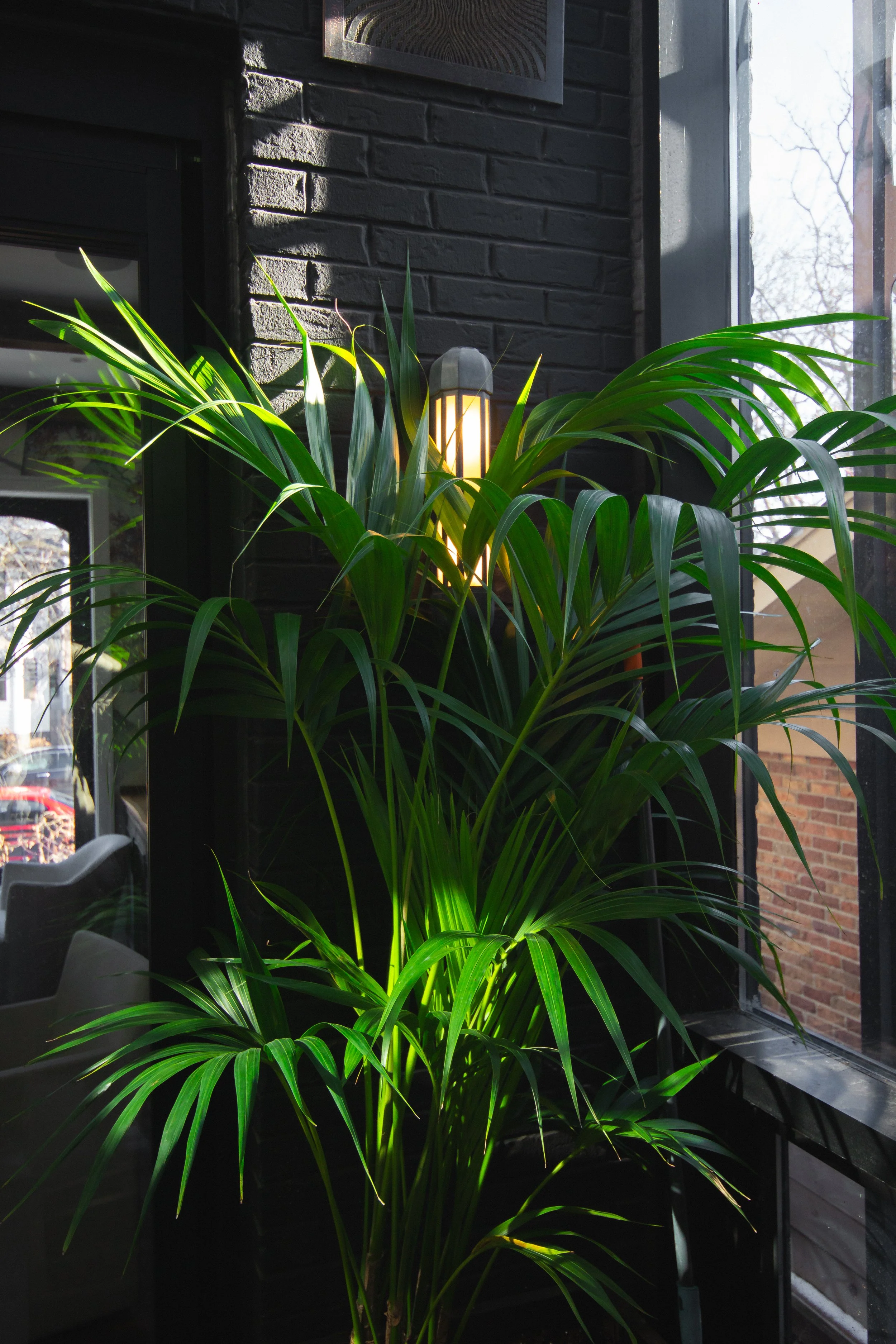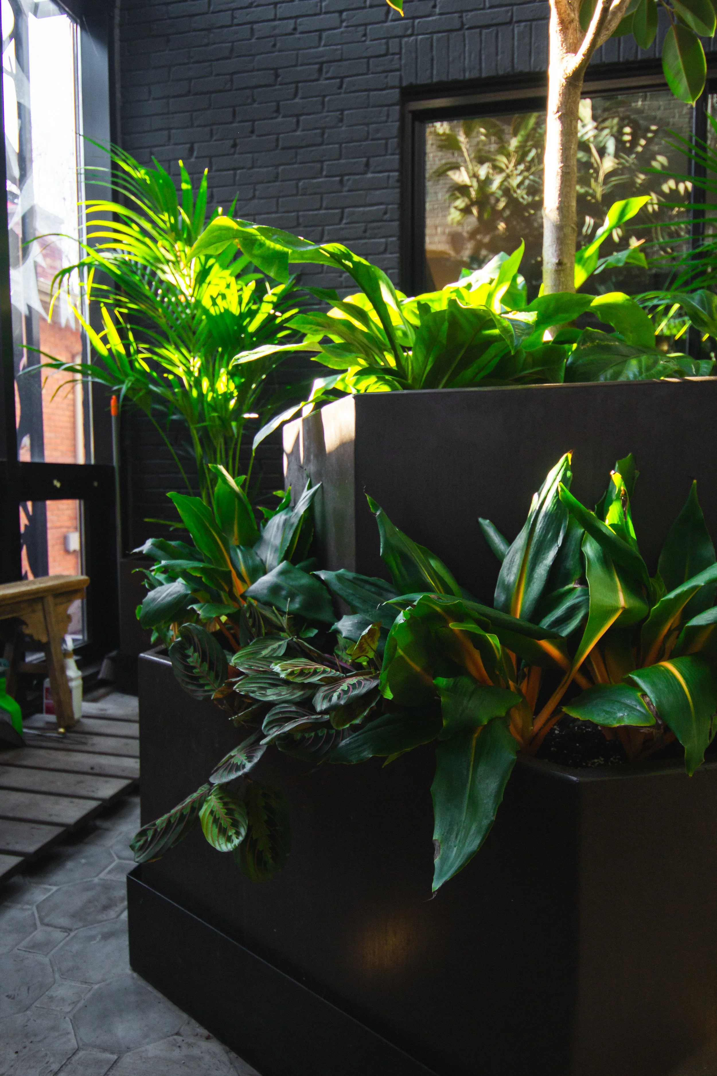 Tropical layering: Diverse foliage in varied sizes, textures, and colors creates depth and movement against monochromatic surfaces