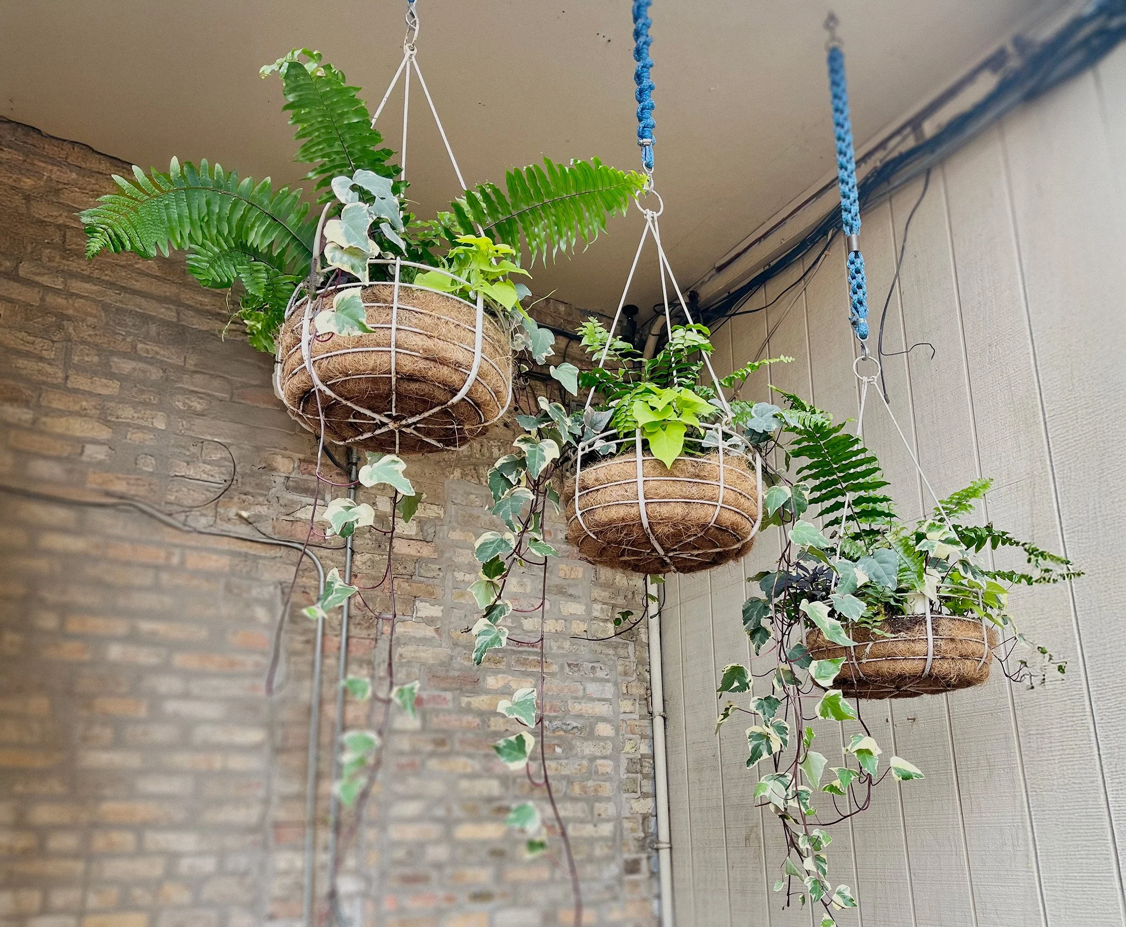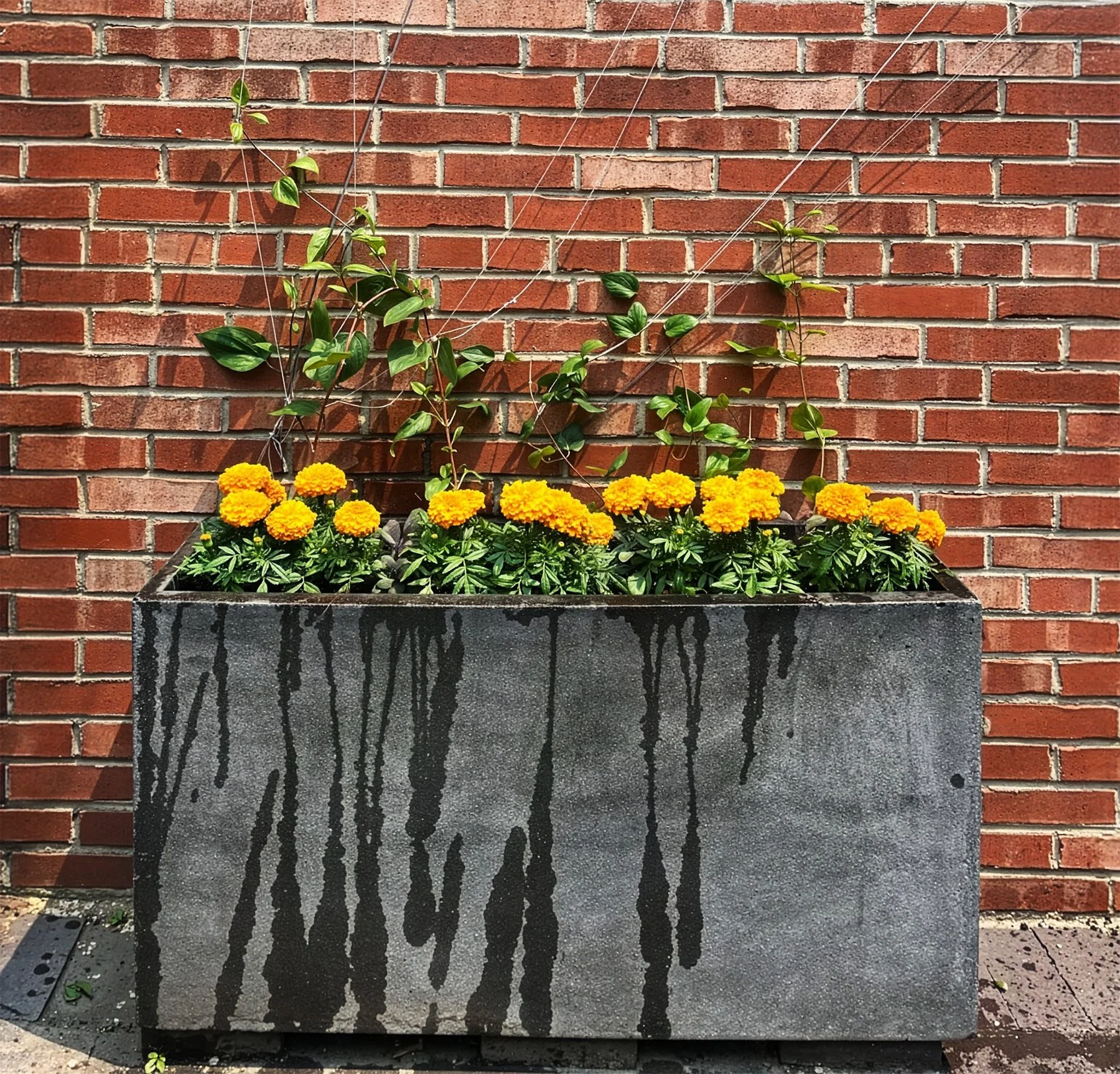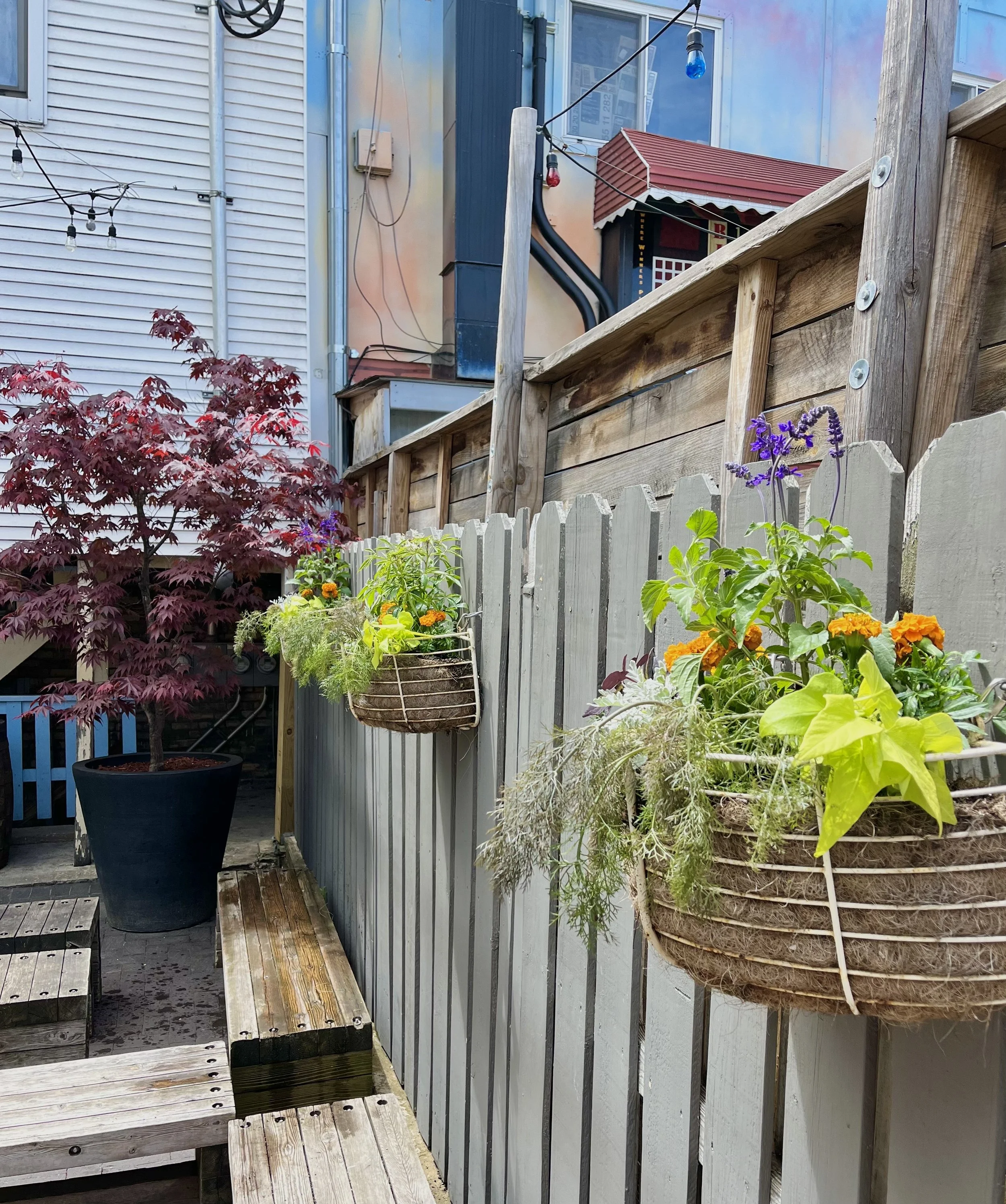 This popular music and dance venue livens their outdoor space with sturdy annuals and dynamic herbs. Ivy dances with the HVACs and chartreuse foliage pops against the gray urban landscape.